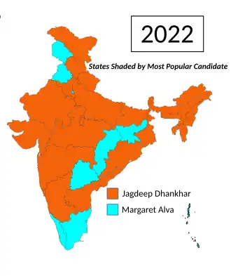 The election for the 14th vice president of India was held on 6 August 2022. The announcement was made by the Election Commission of India. Article 67 of the Constitution of India provides that the vice president of India shall remain in office for a period of five years.[1] The winner of this election was Jagdeep Dhankhar who succeeded Venkaiah Naidu as vice president on 11 August 2022.[2][3] On 16 July 2022, Jagdeep Dhankhar the then serving Governor of West Bengal was nominated as a vice-presidential candidate by the BJP.[4] On 17 July 2022, Margaret Alva was announced as the vice-presidential candidate by the UO and some non-UO Parties. Hence, Jagdeep Dhankhar won the election by 528 votes defeating the United Opposition candidate Margaret Alva. He secured the highest number of electoral votes in more than 30 years.