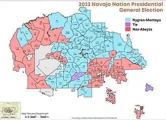 The 2022 Navajo Nation presidential election took place on Tuesday, November 8, 2022, to elect the president and vice president of the Navajo Nation. The primary election was held on August 2. Incumbent president Jonathan Nez ran for reelection with attorney Chad Abeyta as his running mate. Incumbent Vice President Myron Lizer did not seek re-election, instead running for U.S. House in Arizona. Nez and Abeyta advanced to the general election, as did the challenging ticket of construction manager Buu Nygren and Torreon/Star Lake Chapter President Richelle Montoya. Nygren and Montoya won the general election by a 6-point margin, and Montoya became the Navajo Nation's first female vice president.[1][2]
