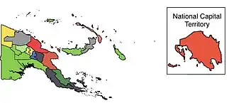 The 118 members of the National Parliament are elected from single-member constituencies by limited instant-runoff voting; voters are given up to three preferences, with a candidate declared elected once they received over 50% of preference votes.[16] Of the 118 members, 96 are elected from "open" seats and 22 from provincial seats based on the twenty provinces, the Autonomous Region of Bougainville and the National Capital District. The winners of the provincial seats also become the provincial governor.[17]