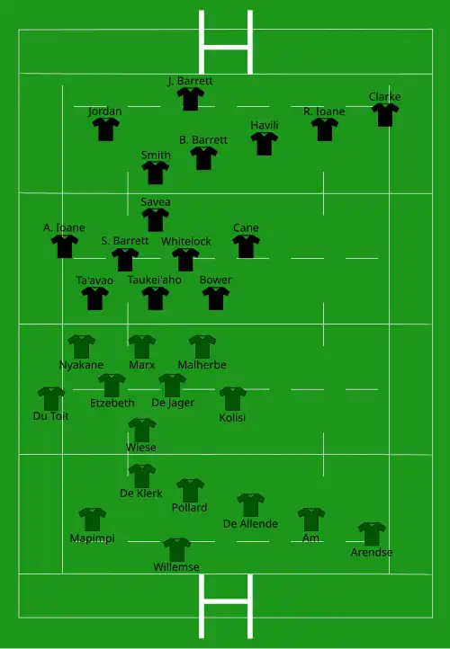 | Try: Arendse 9' c le Roux 80' c Con: Pollard (2/2) 10', 80' Pen: Pollard (3/3) 22', 50', 73' Drop: Pollard (1/1) 58' | Report | Try: Frizell 78' c Con: Mo'unga (1/1) 79' Pen: J. Barrett (1/1) 35' |