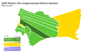 On March 25, 2021, Rizal's 2nd congressional district—which then included San Mateo—was split into three districts, with the third solely encompassing San Mateo.[4] The second district in its previous form was last represented by Juan Fidel Nograles, who was re-elected in 2019 with 69.01% of the votes within the municipality.[9] Nograles, who hails from Rodriguez, was redistricted to the fourth district, leaving the third district with an open race as a result.[11][12]