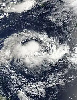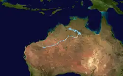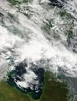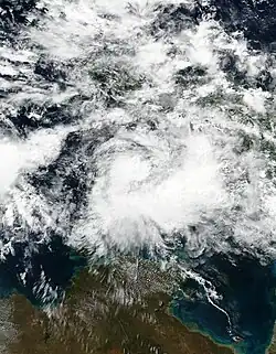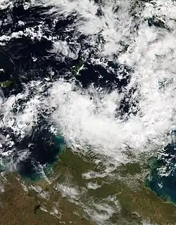 On 7 January, the BoM noted the possibility of a tropical low forming near the north Kimberley, as a monsoon trough was expected to develop along the Top End. It was predesignated as 03U.[54] This came to fruition 4 days later, when the BoM reported that it was developing over the southern Joseph Bonaparte Gulf within the trough.[9] As the tropical low tracked overland, the system maintained a robust outflow channel in the upper troposphere.[55] The BoM continued to monitor the low as it moved slowly southeast,[56] then turning west towards Western Australia by 20 January,[57] until they determined that it would not develop into a tropical cyclone on 23 January.[58][59]