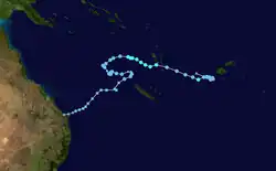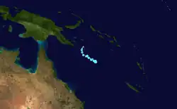 On 29 January, the BoM noted that a subtropical low was expected to form off the coast of Eastern Australia in a few days, designating it as 06U.[83] The next day, the BoM began monitoring the low as it was developing in the eastern portion of the basin, about 125 km (80 mi) to the northeast of Kgari in Queensland, Australia.[1][84][85] Over the next couple of days, the system moved north-eastwards and moved into the South Pacific basin during 1 February, where it was classified as Tropical Disturbance 05F by the Fiji Meteorological Service.[1][12] At this stage, the system was located in an area of moderate vertical wind shear and good upper-level divergence about 675 km (420 mi) to the northwest of Nouméa in New Caledonia, while atmospheric convection persisted over the system's LLCC.[12] After meandering outside the basin for several days, the system re-entered the basin as a tropical low.[86] Environmental conditions were assessed as being marginally conducive for tropical cyclogenesis, with warm sea surface temperatures near 29–30 °C (84–86 °F) and low vertical wind shear.[87] It again exited the basin on 7 February, as the storm was struggling due to moderate wind shear.[88]