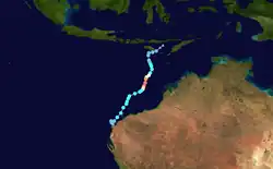 On 9 January, the BoM noted that a tropical low could form in the Indian Ocean, designating it as 04U.[40] Later the next day, the BoM reported that it had formed to the northwest of the Cocos Islands.[41] On 11 January, the JTWC followed suit in monitoring the system, after convection had significantly consolidated around the circulation.[42] Three days later, the agency issued a TCFA, for the disturbance as it was situated in an environment of warm waters, low shear, and good outflow.[43] By 15 January, the JTWC began issuing advisories, recognising it as Tropical Cyclone 06S after its circulation had improved,[44] with the BoM subsequently followed suit and upgraded it to a Category 1 tropical cyclone.[45] Since the cyclone was within their area of responsibility, Meteorology, Climatology, and Geophysical Agency (BMKG) named the system Anggrek.[46] It tracked southeast before changing direction and tracking west.[47] Anggrek remained nearly stationary due to weak steering ridges to the north and southwest, the system generated upwelling, causing sea surface temperatures to decrease.[48] Despite that, Anggrek steadily re-intensified,[49] and after entering favourable conditions on 24 January, became a Category 3 severe tropical cyclone, with estimated maximum 10-minute sustained winds of 150 km/h (90 mph), and a central barometric pressure of 968 hPa (28.59 inHg).[50][51] while the system's depiction showed that tightly circulating around a ragged eye.[52] The next day, the system exited the basin towards the South West Indian Ocean.[53]