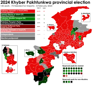 Provincial elections were held in the Pakistani province of Khyber Pakhtunkhwa on 8 February 2024 to elect members of the 12th Provincial Assembly of Khyber Pakhtunkhwa. On 5 August 2023, the results of the 2023 digital census were approved by the Council of Common Interests headed by Prime Minister Shehbaz Sharif. Therefore, elections have been delayed for several months, as new delimitations will be published on 14 December 2023, as announced by the Election Commission of Pakistan (ECP).[2][3] On 2 November 2023, the ECP announced, in agreement with the President of Pakistan, Arif Alvi, that the elections would be held on 8 February 2024.[4] This election was held concurrently with nationwide general elections and other provincial elections.