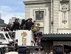 During the parade on June 15, a Denver police officer was struck in the lower leg by a fire truck which was transporting multiple Nuggets players, including Nikola Jokić and Jamal Murray.[73][74] Jokić's wife, Natalija, was hit in the face with a beer can while riding on the fire truck during the parade.[75]