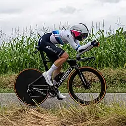 The fastest time on the stage was set by Reusser, two-time silver medalist at the time trial world championships and silver medalist in the time trial at Tokyo 2020.[46][47] Kopecky then set a fast time, 38 seconds slower than Reusser. Next on the stage was Van Vleuten, who finished 1 min 41 s slower than Reusser. Finishing fourteenth on the stage, she fell off the overall podium into fourth place. Niewiadoma had a 38-second lead over Van Vleuten, and a 45-second lead over Kopecky. Her time trial was 1 min 23 s slower than Reusser, finishing ninth on the stage. Kopecky therefore took second place overall by 21 hundredths of a second.[46][47] Niewiadoma was third overall.[48][49]