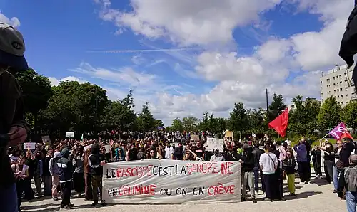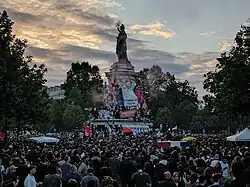 On 9 June 2024, protests started immediately following the European election results, where several hundred people demonstrated against the RN's victory at Place de la République in Paris and called for a "union of the left" in the next legislative elections and several dozen people chanting anti-Jordan Bardella slogans in Lille.[40] Many labour unions, student groups, human rights groups, and political parties called for rallies in order to oppose the anti-immigration and Eurosceptic policies of National Rally, and to promote "progressive alternatives for the world of work".[41][42] Political parties that called for rallies included the Socialist Party, Communist Party, The Ecologists and La France Insoumise, while union groups calling for rallies included the French Democratic Confederation of Labour (CFDT), the General Confederation of Labour (CGT), the National Union of Autonomous Trade Unions (UNSA), the Fédération Syndicale Unitaire (FSU), and the Solidaires, promoting the "largest possible" demonstrations.[42]