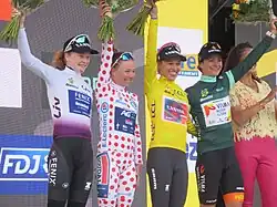 - ^ On stages 5 and 6, Shirin van Anrooij, who was second in the young rider classification, wore the white jersey, because first-placed Puck Pieterse wore the polkadot jersey as the leader of the mountains classification.