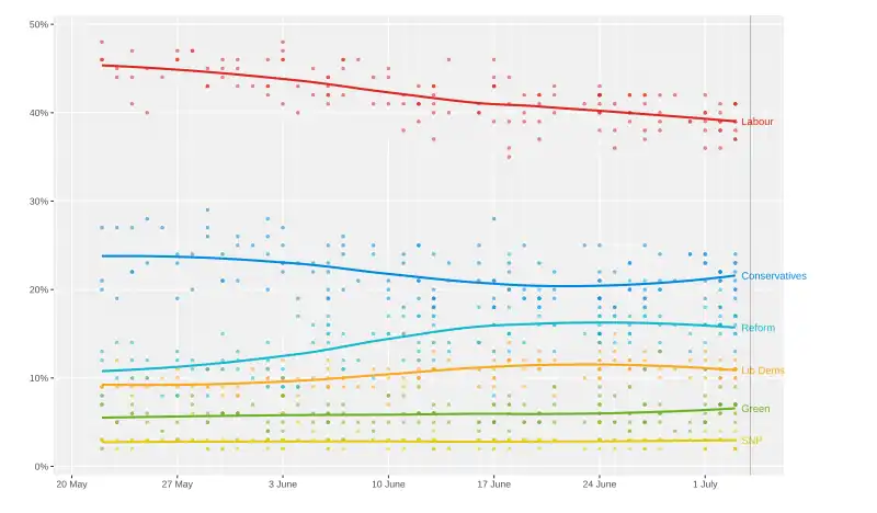 - ^ "Model update / How would the UK vote if the election was held today?". Britain Elects on X. 7 June 2024. Archived from the original on 9 June 2024. Retrieved 7 June 2024.