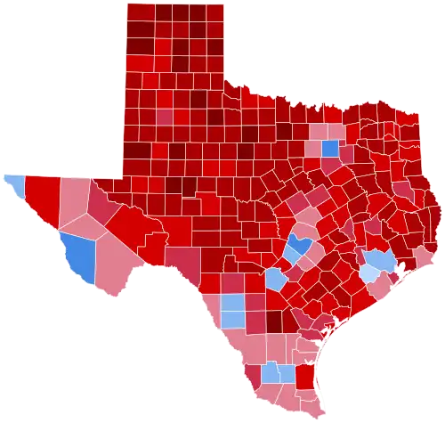 Texas was considered by some to be potentially in play, as the state had not backed a Republican for president by double digits since it favored Mitt Romney in 2012. This increased competitiveness was largely explained by the fast-growing Texas Triangle trending leftwards in some elections, namely in the closely-contested 2018 U.S. Senate race and the 2020 U.S. presidential election, which saw the Metroplex county of Tarrant and the Greater Austin counties of Williamson and Hays flip to the Democratic candidate for the first time in decades. However, in the 2020 state elections, predominantly Hispanic South Texas shifted significantly Republican, a trend that the rest of the state followed in the 2022 midterms.[2][3] In 2024, Trump went on to win Texas by a margin of over 1.5 million votes, the second-largest margin of victory for any presidential candidate in Texas history.[4] Trump won 242 out of the state's 254 counties, the most for a Republican since 1972.