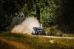 The first gravel rally of the season was Portugal, where Ogier and Landais won, and it was Ogier's sixth Portugal win.[78] They were on course for a hat-trick of victories at Sardegna, but a puncture at the Power Stage meant Tänak and Järveoja overtook them to win.[79] The winning margin was only 0.2 seconds, the joint closest win (with the 2011 Jordan Rally) in WRC.[80] Ogier and Landais withdrew from the Polish Rally before it began, due to a road accident during recce.[81] Rovanperä and Halttunen were their replacements for Toyota,[82] who won the rally despite limited preparation.[83] They also won the following round in Latvia, leading the rally from start to finish[84] and taking their 200th stage victory.[85] Having debuted in Poland, the Latvian pair, Sesks and Francis, won their first stage early in their home rally.[86] They were on course for a maiden podium finish, but a differential issue on the final day caused them to drop out of contention.[87]