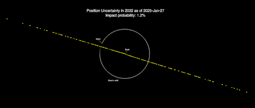 - ^ a b c Whitt, Kelly Kizer (27 January 2025). "Asteroid 2024 YR4 has non-zero odds of hitting Earth". EarthSky. Archived from the original on 28 January 2025. Retrieved 27 January 2025.