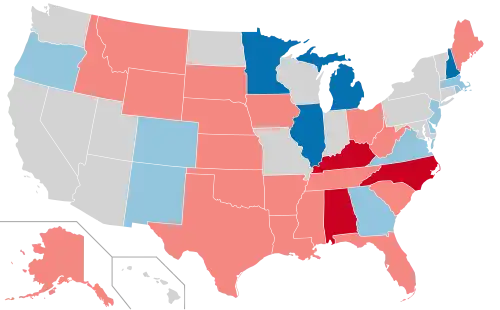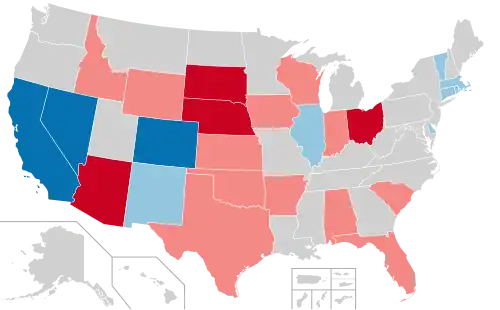 | Map of the incumbents: Democratic incumbent Term-limited or retiring Democrat Republican incumbent Term-limited or retiring Republican Independent incumbent No election | |