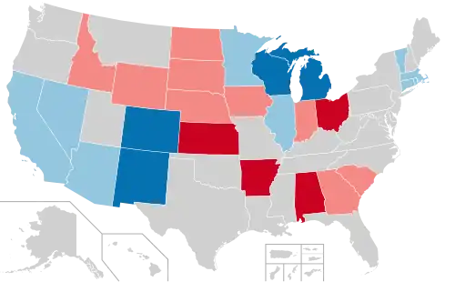 ![]() Democratic incumbent Term-limited or retiring Democrat Republican incumbent Term-limited or retiring Republican No election | ||||||||||||||||