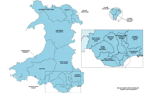 Following the reduction in the number of Welsh MPs and the implementation of new constituency boundaries for the 2024 UK general election,[8] the proposals[5] and subsequently the 2024 act, required the new Senedd constituencies to be contiguous pairings of the 32 UK Parliament constituencies used in Wales since the 2024 UK election.[9] Therefore there would be 16 constituencies, electing six members each, to replace the existing 40 constituencies and five regions.[10] The commission was also required by the law to give constituencies a single name in both Welsh and English, unless it could be considered unacceptable for a single name.[11] The commission later decided all the new constituencies were to use Welsh-only names.[12]
