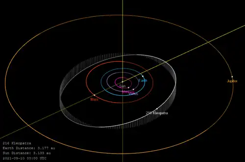 216 Kleopatra is a non-family asteroid from the main belt's background population.[6] It orbits the Sun in the central asteroid belt at a distance of 2.1–3.5 AU once every 4 years and 8 months (1,706 days; semi-major axis of 2.79 AU). Its orbit has an eccentricity of 0.25 and an inclination of 13° with respect to the ecliptic.[4] The body's observation arc begins at Leipzig Observatory (534) on 20 April 1880, ten days after its official discovery observation at Pola Observatory.[1]