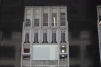 The third floor has a set of window openings on both 40th Street and Madison Avenue.[39] Along 40th Street, the third-floor window openings are asymmetrically arranged on either side of the main entrance, with twelve to the west (right) of the entrance and six to the east (left). All except one of these openings contain sash windows; the remaining opening has a louver.[38] The openings are separated by silver geometric motifs.[20][38] Architectural writer Christopher Gray wrote that the motifs "could be kissing owls, or hooded figures, or the face cards in a deck from another planet".[20] This motif is repeated several times above the main entrance, which is flanked by two flagpoles.[39] On Madison Avenue, there are eight such openings, separated by geometric motifs. Two of these openings have two sash windows each, while the others have one sash window each.[27]