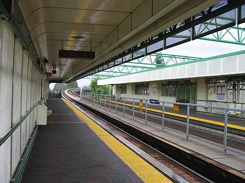 22nd Street is an elevated station on the Expo Line of Metro Vancouver's SkyTrain rapid transit system. It is located on 7th Avenue and 22nd Street in the Connaught Heights neighbourhood of New Westminster, British Columbia, Canada. Due to its proximity to the Queensborough interchange, where the Queensborough Bridge meets with Stewardson and Marine Ways, the station serves as a hub for regional bus routes.