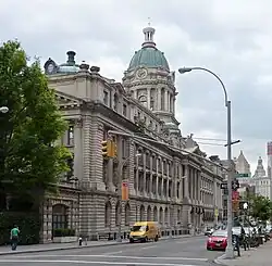 The building was designed by the firm Hoppin & Koen.[4][5][11] After being converted into a luxury co-op building in 1988 by Ehrenkranz Group & Eckstut, it is known as the Police Building Apartments.[4][5] When 240 Centre Street was built, a contemporary source described the building as being designed in a Grecian style.[12] A writer for GQ magazine described the building as being designed in a mixture of the Baroque and Renaissance Revival styles.[13] The New York Times and the New York Daily News likened the building's design to that of the Old Bailey courthouse in London.[14][15] In designing the building, Francis L. V. Hoppin of Hoppin & Koen said the structure's design had taken inspiration from that of New York City Hall, rather than from other police buildings.[16]