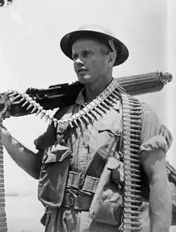![]() 24th Battalion soldier Jim Dempsey with a Vickers machine gun at Helwan | |