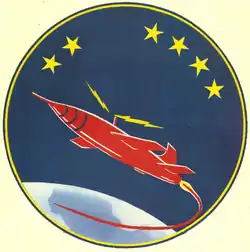- ^ Approved 29 July 1957. Description: On a disc of Air Force blue sky, edged Air Force golden yellow, fimbriated of the first [color mentioned], a red stylized missile, highlighted white, rising, nose to dexter chief, three stripes of the field['s color] encircling the nose, the antenna emitting two Air Force golden yellow lightning flashes; all between six stars arched of the last [color mentioned], two in dexter chief, four in sinister chief, and the edge of the globe in base, water areas light blue, land areas white; a red and Air Force golden yellow vapor trail edged white circling over the globe. Significance: The red stylized missile denotes the armament capability of the missile and designates this squadron as a missile unit. The lightning flashes above the missile represent the guidance features of the missile. The three blue stripes around the nose denote the three distinct types of teams authorized in the squadron maintenance and operations branches. The Earth indicates that the missile capabilities are not limited by the geographic features of location. The yellow border symbolizes the organization of the squadron by providing unity to the various functions in the squadron.