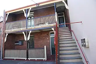 These large terraces feature elaborate timber verandahs with ornamental brackets in the Federation style. Also, they have terracotta Marsailles roofs. The terrace consists of a two bedroom units on both the ground floor and the first floor. The stairs leading to the upper units are generally shared by two units, with the entry to the lower units directly to the sides of them. Storeys: Two; Construction: Facebrick walls, tiled roof, timber verandah and balustrading. Style: Federation.[1]