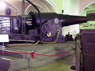 In 1864, Russia had ordered a single muzzle-loading 11-inch gun at Krupp.[9] When Russia decided to exclusively use breechloaders, this 11-inch muzzleloader was in a forward state of manufacture, but it was nevertheless decided to change it to a breechloader. A trial gun was then made by using the 11-inch muzzle loader's inner tube, and by adapting it to breech-loading.[2]