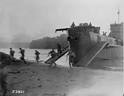 In July 1943, Major General Harold Barrowclough, having taken over command of the division from Cunningham, advised the New Zealand Government that it was ready for combat duties.[12] Accordingly, it was sent to New Caledonia. Here it underwent further combat training and during this time, one member of the battalion died from food poisoning.[13] In early September 1943, it then moved to Guadalcanal as the 3rd Division was given a combat role as part of the Solomon Islands campaign. Within this, the 29th Battalion took part in the 8th Brigade's landing on Mono Island as part of the plan to secure the Treasury Islands from the Japanese in order to conduct future operations on Bougainville, in the first opposed amphibious landing carried out by New Zealand troops since the Gallipoli campaign in 1915.[14][15] Coming ashore near Falamai in late October, on the island's southern coast, the 29th landed alongside the 36th Battalion, amidst light opposition from Japanese defenders. After the beachhead was secured, patrols were sent inland towards Malsi as Japanese opposition began to grow. By early November, Japanese resistance had largely been overcome following the repulse of a heavy Japanese counter-attack on 2–3 November, although patrol clashes continued throughout December 1943 and into January 1944.[16][17]