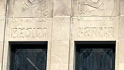 Strong commissioned Holabird & Root to design a modern structure that would house 2,000 Daily News employees and provide studio space for his radio station, WMAQ. The building’s bold design and Art Deco façade were widely regarded as shot fired at the Chicago Tribune, which operated out of the Tribune Tower, a large Neo Gothic building on North Michigan Avenue completed in 1925. Inside, the building featured a much-admired mural by John W. Norton. It was dominated by diagonal lines, and divided into three sections: Gathering the News, Printing the News, & Transporting the News.[5] In the fall of 1993, it was removed and put into storage, where it has remained.[6] Outside, it had bas-reliefs depicting Benjamin Franklin, Charles Anderson Dana, Horace Greeley, Joseph Pulitzer, Samuel Bowles III, James Gordon Bennett and Joseph Medill[3] and a fountain honoring Victor Lawson. The Chicago Daily News Building was completed in June 1929 at a cost of $8 million.[7] During the dedication ceremony, President Herbert Hoover pressed a button that started the presses. The Daily News ceased publication in 1978. Although the building has since been renamed Riverside Plaza, according to the Tribune’s architecture critic, the Daily News Building remains, “one of Chicago's finest examples of Art Deco architecture and a path-breaking work of engineering and urban design.”[8]
