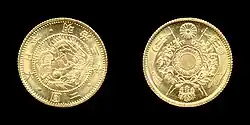 Japan officially went onto the gold standard in 1897 from reserves obtained after the first Sino-Japanese War.[3][5] New laws were passed that abolished the Japanese silver trade dollar, as well as the one silver yen piece. The two yen gold coin was also not among the new coins scheduled to be minted.[3] Two yen gold coins were finally abolished as legal tender in 1988, by this time the exchange rate for gold coins to Japan's modern circulating currency as a whole was zero.[6]