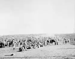 The brigade fought its first major action of this campaign in early August 1916 during the Battle of Romani, which took place 35 kilometres (22 mi) to the east of the canal.[26] Ryrie was absent during the battle, attending an imperial parliamentary conference in London, and in Colonel John Royston temporarily commanded the brigade during this time.[14] Prior to the battle, the 1st Light Horse occupied several outposts, the 2nd Light Horse Brigade was deployed to carry out reconnaissance after the advanced elements of the Ottoman advance on Romani was detected by patrolling aircraft. The weight of the initial attack on 3 August fell on the 1st Light Horse, which was threatened with being outflanked until the 2nd Light Horse Brigade secured their right flank. They were pushed back further as the Ottomans secured several high features, but held the centre while other units launched a counter-attack. Early on 5 August, the 1st and 2nd Light Horse Brigades launched an attack with bayonets around Wellington Ridge.[27] As the tide of the fighting turned, in the following days, the brigade was committed to the pursuit that followed as the Ottoman forces began to withdraw, taking part in another action around Katia.[8][9][10]