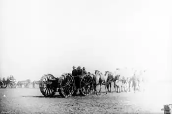 The reorganised EEF renewed its offensive (the Third Battle of Gaza) on 27 October. XX Corps, including 53rd (W) Divisional artillery, moved into position during the night of 30/31 October to capture Beersheba, and the bombardment began at 05.55. After a pause at 07.00 to let the dust settle and determine the effect, the guns reopened. Infantry parties advanced to within 30 yards (27 m) of the barrage to finish cutting the barbed wire. They then rushed Point 1069 and the 18-pounder batteries began to move up to more advanced positions. Beersheba had fallen to the Desert Mounted Corps and XX Corps could bivouack on the objective.[27][28] On 3 November 53rd (W) Division was ordered to advance to the Tel es Sheria road. The right column consisted of 160th (South Wales) Brigade but only one battery of CCLXVII Bde because of the shortage of water for the horses. It was a difficult march over broken country in hot weather and the gunners had to haul their guns up to the head of the valley to get in range of the Khuweilfe heights. 160th Brigade met determined opposition and could not clear the wells at Khuweilfe before nightfall. The attack was renewed at 05.00 next morning, but the artillery support ceased when the ammunition wagons could not get up to the guns, and the infantry only got as far as Hill 1706. However, on 6 November the division assaulted the Khuweilfe position supported by an intense bombardment by all its own guns and a heavy battery. After confused fighting the position was held, with the support of the divisional artillery breaking up Turkish counter-attacks.[29][30][31]