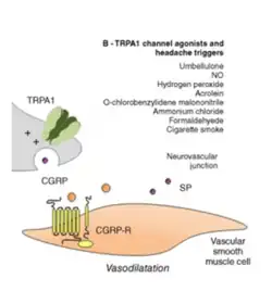 It is hypothesized to cause headaches by influencing the trigeminovascular system via TRPA1.[1]