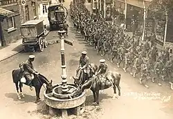 Men of the 5th (Service) Battalion, Royal Irish Fusiliers at Basingstoke in May or June 1915 during the battalion’s brief stay in Basingstoke before embarkation for Gallipoli. Incidentally it also shows the importance of horses in everyday life at the time of the First World War. The water trough stood at the junction outside the Wheatsheaf pub.