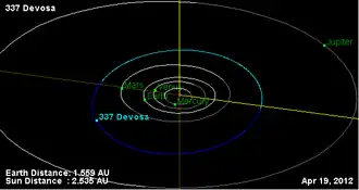 337 Devosa is a large Main belt asteroid. It was discovered by Auguste Charlois on 22 September 1892 in Nice. The asteroid is orbiting the Sun at a distance of 2.38 AU with a period of 3.68 years and an eccentricity (ovalness) of 0.14. These orbital elements are similar to that of the large asteroid 4 Vesta.[3] The orbital plane of 337 Devosa is tilted at an angle of 7.85° to the plane of the ecliptic.[1]