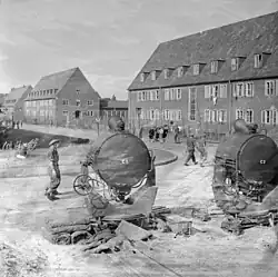 After the break-out from Normandy, 344 Bty provided illumination for the engineers engaged in bridging operations at the River Seine on the night of 29/30 August, a section of A Troop with XXX Corps at Vernon, and B Troop with XII Corps at Louviers.[22] In the subsequent pursuit over Northern France and Belgium, 344 Bty formed part of 106 AA Bde protecting XII Corps as it advanced from the River Somme to Antwerp, with individual Troops widely scattered supporting different formations. This caused practical problems for the BHQ and REME workshop in supplying carbon rods to individual detachments for the arc lamps and in servicing their searchlight control (SLC) radars.[22][26]