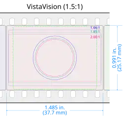 The VistaVision motion picture format was created in 1954 by Paramount Pictures to create a finer-grained negative and print for flat widescreen films.[55] Similar to still photography, the format uses a camera running 35 mm film horizontally instead of vertically through the camera, with frames that are eight perforations long, resulting in a wider aspect ratio of 1.5:1 and greater detail, as more of the negative area is used per frame.[50] This format is unprojectable in standard theaters and requires an optical step to reduce the image into the standard 4-perf vertical 35 mm frame.[56]