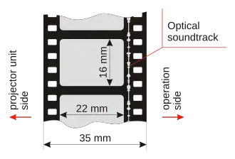 35 mm film is a film gauge used in filmmaking, and the film standard.[1] In motion pictures that record on film, 35 mm is the most commonly used gauge. The name of the gauge is not a direct measurement, and refers to the nominal width of the 35 mm format photographic film, which consists of strips 1.377 ± 0.001 inches (34.976 ± 0.025 mm) wide. The standard image exposure length on 35 mm for movies ("single-frame" format) is four perforations per frame along both edges, which results in 16 frames per foot of film.