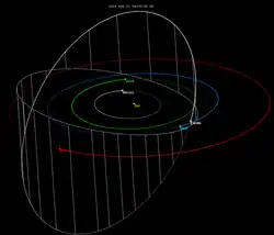 Camillo came to perihelion on 27 December 2012.[3] On 12 February 2013 the asteroid passed 0.14775 AU (22,103,000 km; 13,734,000 mi) from Earth[3] and had an apparent magnitude of 13.[4] During the 2013 passage the asteroid was studied by radar using Goldstone and Arecibo.[4]