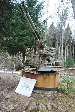 The 37 mm automatic air defense gun M1939 (61-K) (Russian: 37-мм автоматическая зенитная пушка образца 1939 года (61-К)) is a Soviet 37 mm calibre anti-aircraft gun developed during the late 1930s and used during World War II. The land-based version was replaced in Soviet service by the AZP S-60 during the 1950s. Guns of this type were successfully used throughout the Eastern Front against dive bombers and other low- and medium-altitude targets. It also had some usefulness against lightly armoured ground targets.
