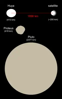The satellite tightly orbits Huya with a separation distance of 1,900 km (1,200 mi) and an orbital period of 3.46 days. It has a diameter between 165–243 km (103–151 mi), or roughly half of Huya's diameter.[7]: 8 With its large size relative to Huya, the satellite is expected to have tidally locked Huya's rotation, but observations of Huya's short rotation period show this is not the case.[56][8]: 7 This suggests that the satellite has a low density, likely around 0.5 g/cm3.[56] A similar scenario has been observed in the binary Kuiper belt object 174567 Varda, whose rotation is not tidally locked to its large satellite Ilmarë.[8]: 7