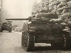 In early 1945, 3rd Armored Division was one of two divisions in the Army to receive the M26 Pershing tank. Hogan distributed his precious few Pershings to each company so they could lead the attacks as the German defense grew more fanatical. The Americans were glad to finally a receive a battle tank capable of taking on the much heavier and powerfully armed enemy Mark V Panther and Mark VI Tiger tanks.[3]