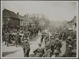 At the time of World War I, Royal Field Artillery regiments were designated as brigades, which consisted of three artillery batteries merged. Each brigade would use only one type of artillery gun.[5] In addition to the three batteries, each brigade also contained an ammunition column and base depot. The column consisted of 158 officers and men and controlled the movement of all artillery, supplies, and security groups. The depot consisted of a junior officer, two sergeants, and 40 enlisted men held in reserve as casualty replacements or storemen.[6]