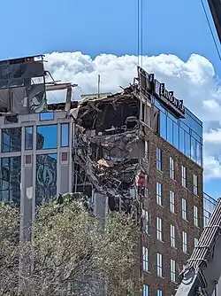 On October 9, 2024, a construction crane of 400 Central collapsed during Hurricane Milton, causing extensive structural damage to several floors of the adjacent 490 First Ave S, more commonly known as the Tampa Bay Times building. No injuries were reported as the area had already been evacuated prior to the storm.[3] The crane collapse also obstructed First Avenue South, a major road leading to downtown St. Petersburg, blocking eastbound traffic for several blocks.