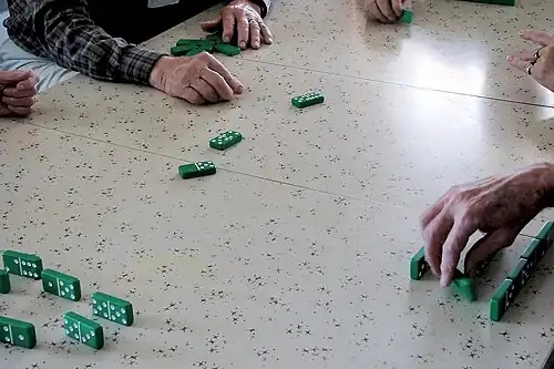 42, also known as Texas 42, is a trick-taking game played with a standard set of double six dominoes. 42 is often referred to as the "national game of Texas".[1] Tournaments are held in many towns,[1] and the State Championship tournament is held annually in Hallettsville, Texas on the first Saturday of March each year.[2] In 2011 it was designated the official State Domino Game of Texas.[3]