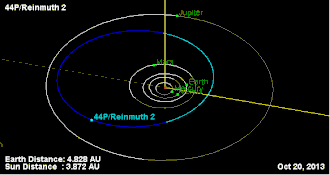 44P/Reinmuth or Reinmuth 2 is a Jupiter-family comet that is greatly perturbed by the gas giant Jupiter.[5] The diameter of this comet is estimated at 3.22 km (2.00 mi)[4] and its absolute magnitude at 14.[2]