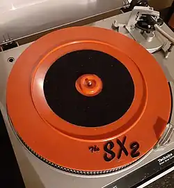 The SX2 and The Extender were designed and manufactured by Mark McLaughlan between the early 1980s and early 1990s.[2] McLaughlan, a Boston area nightclub DJ, came up with the design to make 7" discs easier to handle when mixing. Due to its limited manufacturing run the SX2 has become a sought-after rarity among professional DJs.
