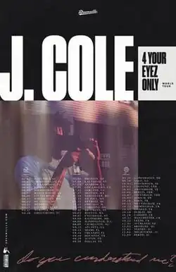4 Your Eyez Only World Tour was a concert tour by American recording artist J. Cole, to support his fourth studio album 4 Your Eyez Only (2016).[2] Dreamville artists J.I.D, Ari Lennox and Lute served as opening acts on the first leg of the tour.[3] Rappers Anderson .Paak and Bas served as opening acts on the second leg of the tour, along with J.I.D and Ari Lennox.[4] Dreamville artists J.I.D., Ari Lennox and EarthGang served as opening acts on the European leg of the tour.[5]