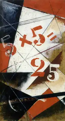 Alexander Vesnin presented five[5] abstract cubist canvases that appear pure abstractions but were, in fact, ultimate decomposition of human figures.[5] Vesnin's catalogue cover, in particular, is typical of his book and advertising art of the period: numbers in two "lines" (5x5 and 25) are offset against the baseline, but this irregularity is "disguised" by angled lines dissecting the space.[6]